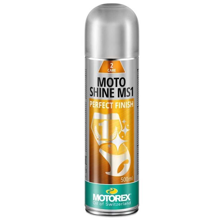 El Motorex Moto Shine MS1 es un aerosol abrillantador para plasticos, metal, cromados, especial diseñado para dar un acabado de exposición a motocicletas y otros vehículos después de la limpieza, proporcionando un brillo duradero y propiedades repelentes de suciedad.